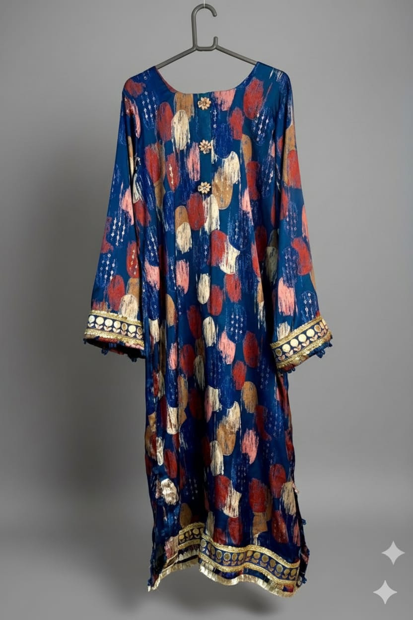 Draped in the finest blue silk. This kaftan is a masterpiece, featuring delicate tassels, gold blue lace sandwiched in tilla and sequins lace, buttons, and a stunning crystal mala detail on the back. Paired with effortless trousers for the complete luxurious look.